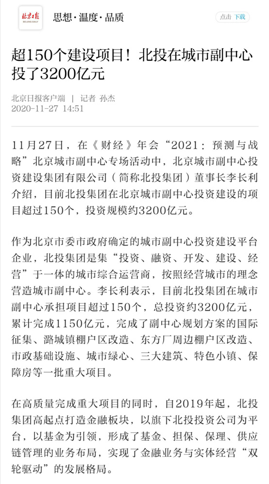 目前,北投集團在城市副中心承擔(dān)項目超過150個,總投資約3200億元,完成了副中心規(guī)劃方案的國際征集、潞城鎮(zhèn)棚戶區(qū)改造、東方廠周邊棚戶區(qū)改造、市政基礎(chǔ)設(shè)施、城市綠心、三大建筑、特色小鎮(zhèn)、保障房等一批重大項目。