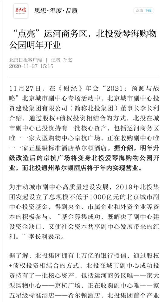 “十四五”時期,北投集團將進一步貫徹落實黨的十九屆五中全會精神和習(xí)近平總書記在北京考察時的重要講話精神,全面貫徹新發(fā)展理念,全力推動城市副中心高質(zhì)量建設(shè)發(fā)展,為將城市副中心打造成為國際一流的和諧宜居之都示范區(qū)、新型城鎮(zhèn)化示范區(qū)、京津冀區(qū)域協(xié)同發(fā)展示范區(qū),助力通州區(qū)繁榮發(fā)展,作出新的更大貢獻。